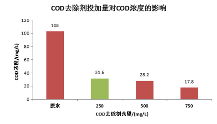 通過小試數(shù)據(jù),在pH值為7.5的情況下,最終選擇濃度為250mg/L的COD去除劑,處理效果最佳,可確保出水COD達(dá)標(biāo)。該去除效果相比之前客戶使用聚合氯化鋁噸水處理成本降低33%,去除效率更高。