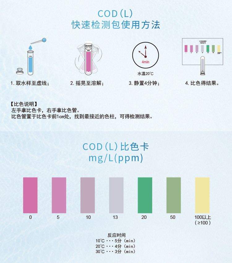 2.本產(chǎn)品使用葡萄糖標液進行校準,250mg/L以上均顯黃色;若要檢測250mg/L以上濃度水樣,請預(yù)先稀釋水樣后再進行測定,具體操作見稀釋說明書。