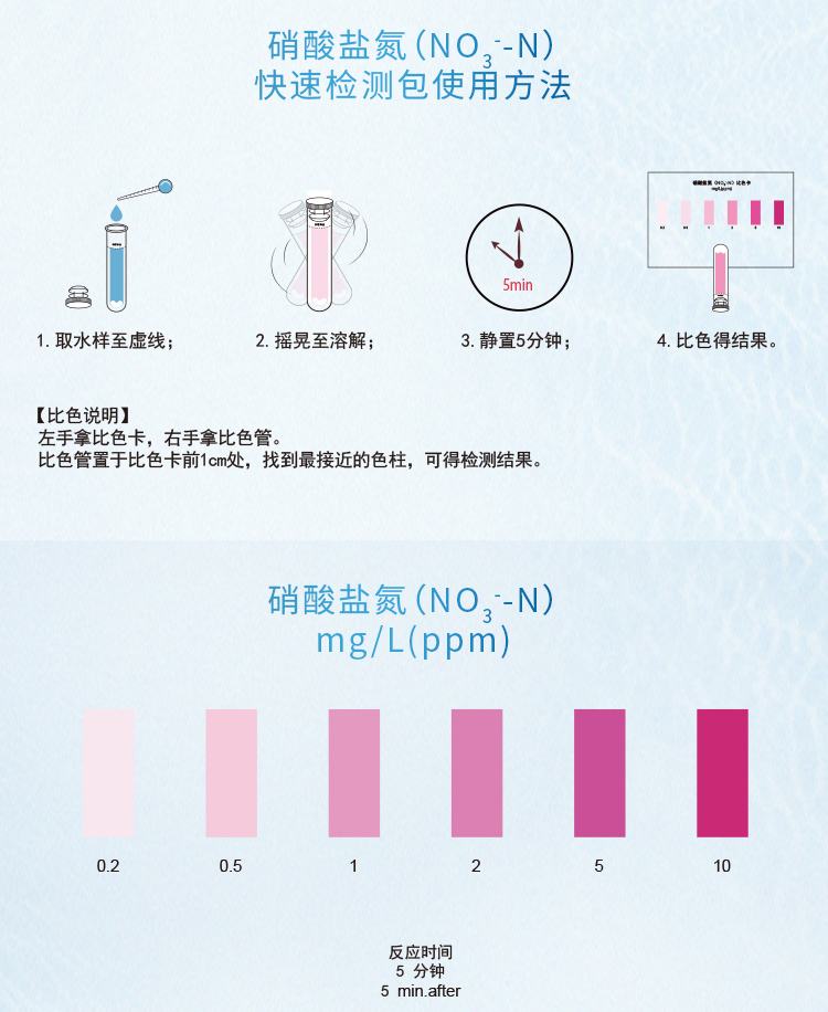 2.本產品檢測水中硝酸鹽氮(NO3- -N)含量在0.2-10mg/L(ppm)范圍內,若要檢測5mg/L以上濃度水樣,請預先稀釋水樣后再進行測定,具體操作見稀釋說明書。