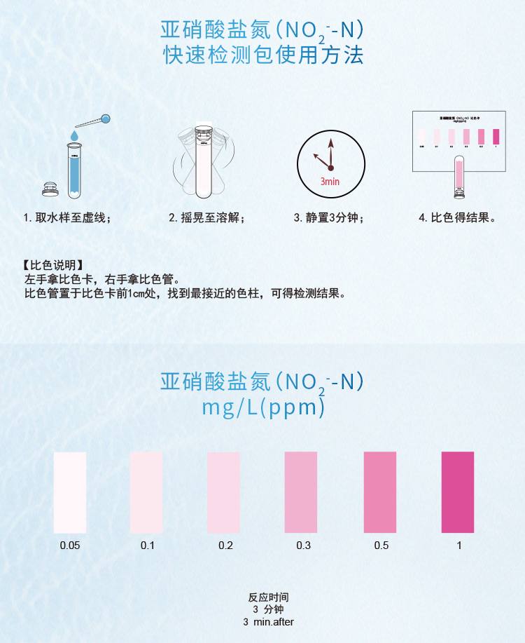 2.本產(chǎn)品檢測水中亞硝酸鹽氮(NO2- -N)含量在0.05-1mg/L(ppm)范圍內(nèi),若要檢測0.5mg/L以上濃度水樣,請預(yù)先稀釋水樣后再進(jìn)行測定,具體操作見稀釋說明書。
